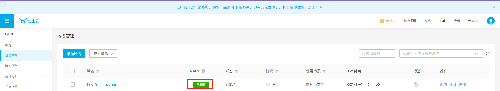 点击域名管理,绑定域名,我这里绑定二级域名img.freecrazy.cn