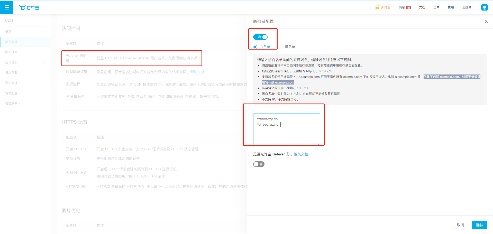 为了不让别人直接引用我们的图片,防盗链还是很有必要的,下面还有个IP黑白名单,哪个月你觉得你的费用多了,可能被盗刷了,找到它的IP丢入黑名单即可。