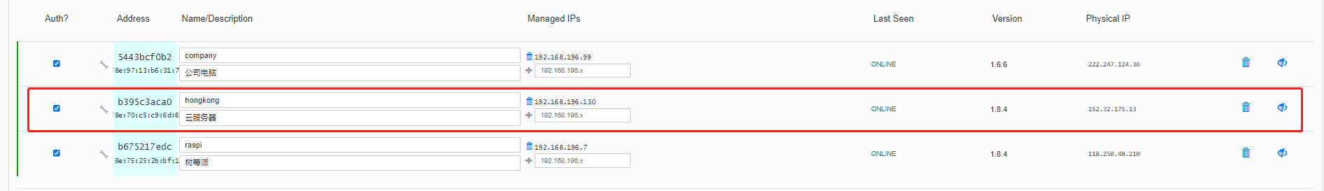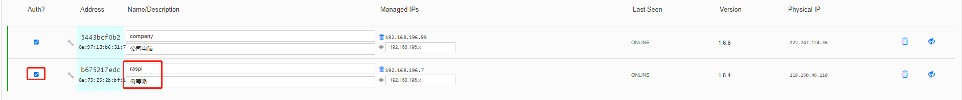 继续去网页授权,ok,现在这两个端可以互相访问了,你可以在公司使用IP访问树莓派的应用端口,IP为下图中的Managed IPs与Physical IP