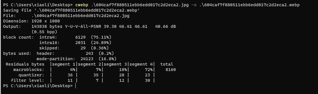 PS:可以使用 -q 指定品质 0-100 默认75 -lossless 无损压缩 其余参考官方文档