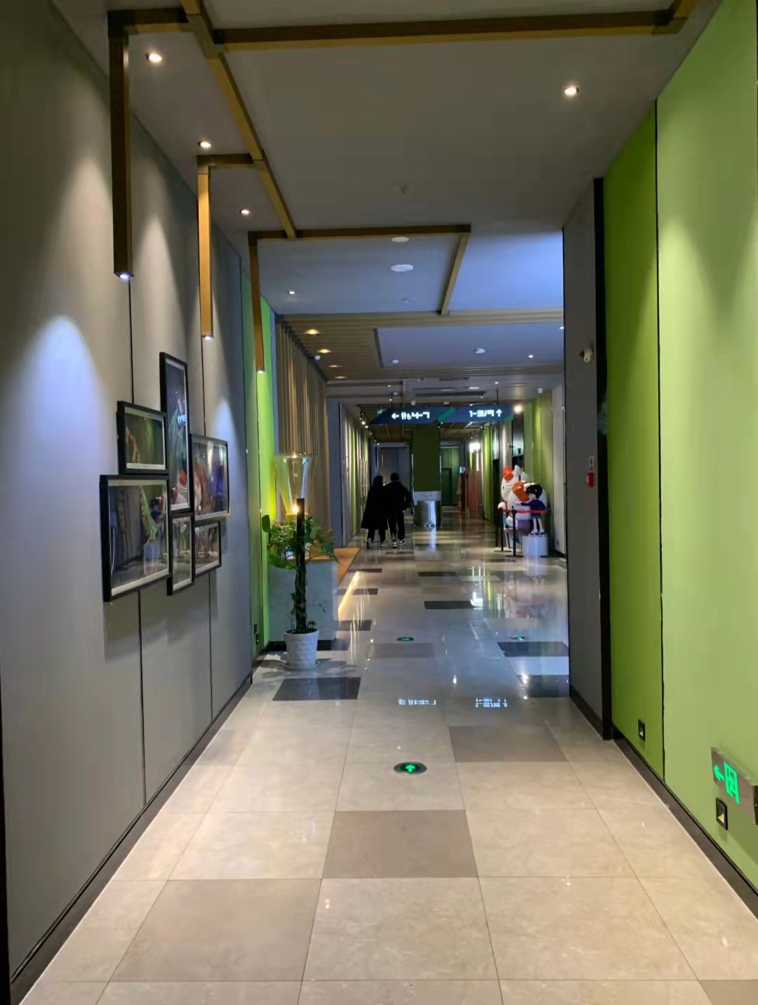 电影院中,设计者颇具匠心,淡绿色的墙壁在合理的灯光打造下,配合延长的走廊使得整体风格充满了清雅温馨感。