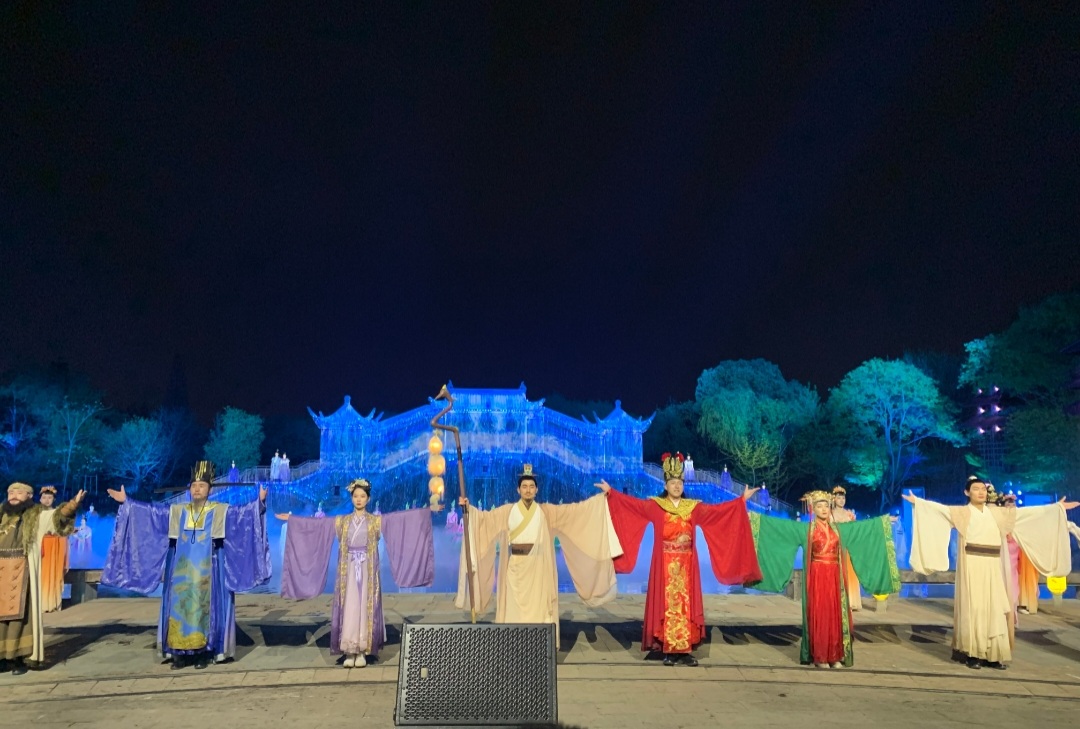 远方一戏剧攫住了眼睛——色彩纷呈的服饰,怪状不一的帽冠,配合着拥抱的手势,不知道是欢迎路人还是展示服饰。