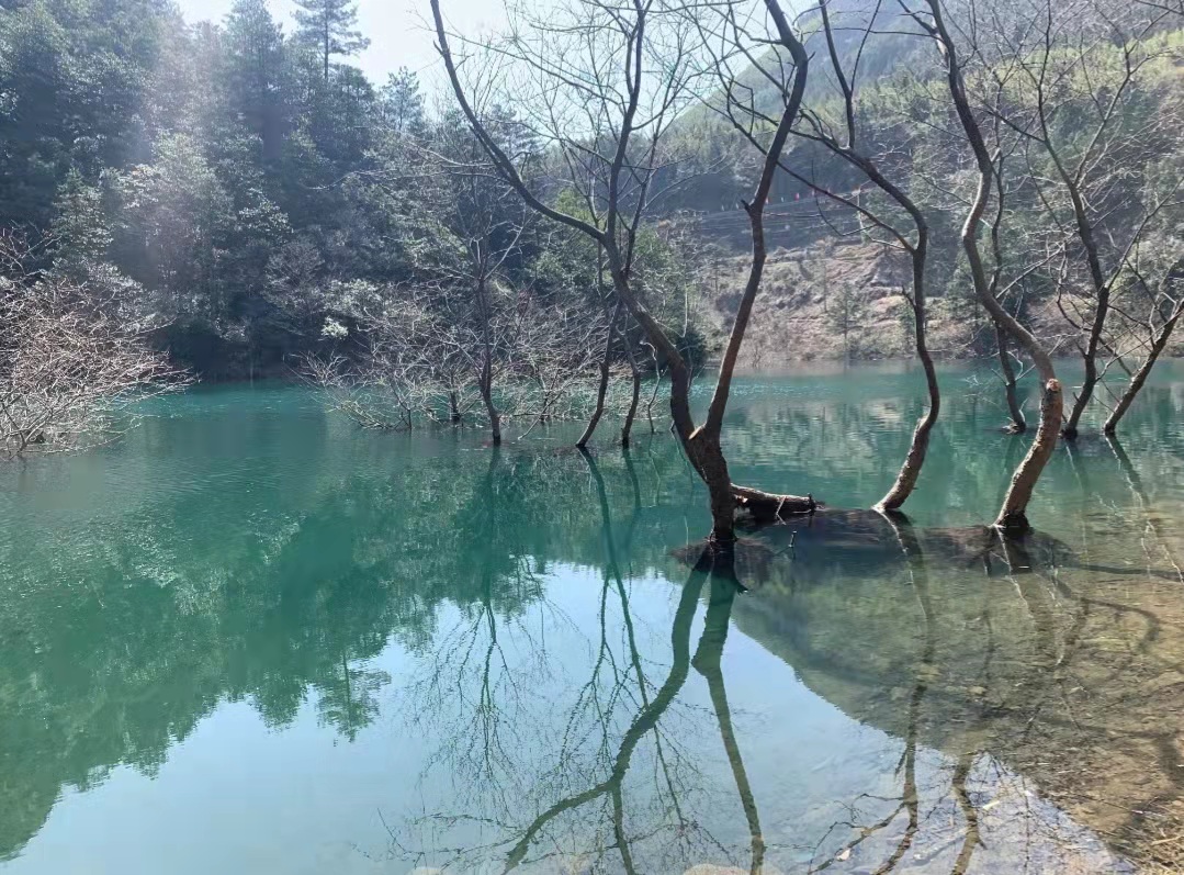 是的,就是图中这种,湖水清莹透彻,湖面波澜不惊,湖下异石林立,湖中树影满目,湖上阳光萦绕,树上蝉虫绝耳。舟行于上,能闻水舟交融声。