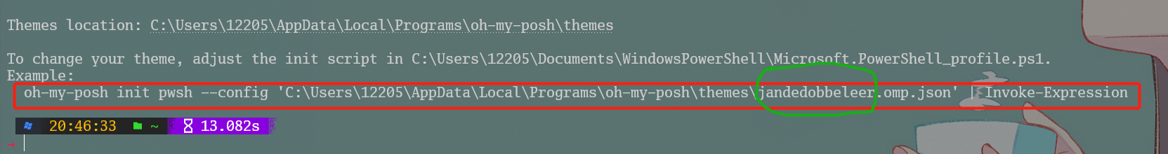 换掉第一行即可,如:oh-my-posh init pwsh --config 'C:\Users\12205\AppData\Local\Programs\oh-my-posh\themes\jandedobbeleer.omp.json' | Invoke-Expression