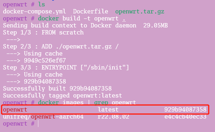 运行完成用 docker images 命令就能看到多了一个叫openwrt的镜像。